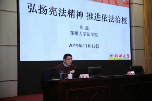 为了认真贯彻习近平总书记关于宪法学习的指示,学院结合“不忘初心、牢记使命”主题教育,深入推进习近平总书记全面依法治国新理念新思想新战略的宣传。11月19日下午,我院在学术报告厅举办了2019年“百名法学家百场报告会”法治宣讲活动。特邀郑州大学法学院副教授郑磊以《弘扬宪法精神、推进依法治校》为题作专题报告,学院党委理论学习中心组成员、科级以上干部和部分师生听取了报告,报告会由副院长董庆主持。