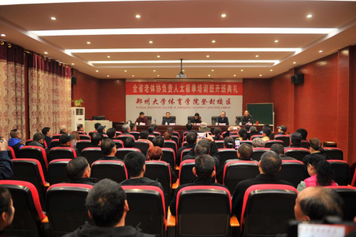 11月19日上午,由河南省老体协主办,河南省老体协太极拳专项委员会、郑州大学体育学院承办的2019年河南省老体协负责同志太极拳培训班在我院登封校区开班,河南省老体协副主席王书义,河南省老体协副秘书长、省老体协太极拳专项委员会副主任魏来周,中国老体协太极拳专项委员会副主任兼秘书长周备锋,我院院党委书记、中国老体协太极拳专项委员会副主任张绍通致欢迎辞。中国老体协会太极拳专项委会副秘书长常全旺主持开班典礼。此次培训为期5天,共有来自全省18个地市、省直管县的75名老体协负责同志参加。