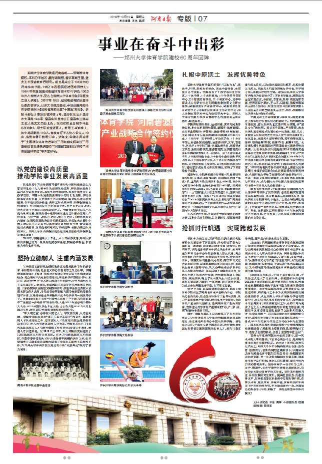 2018年,喜逢改革开放40周年,学院迎来六十华诞。12月19日,河南日报07版以《事业在奋斗中出彩—郑州大学体育学院建校六十周年回眸》为题对我院进行整版宣传。
