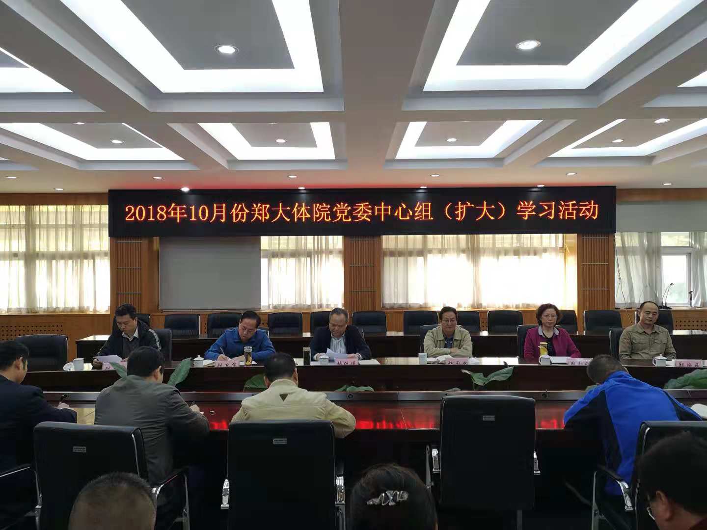 10月30日下午,学院党委在综合楼第三会议室召开党委中心组(扩大)学习会,学习贯彻习近平总书记在全国教育大会上的重要讲话精神。院党委书记张绍通主持会议传达了《中共河南省委高校工委 中共河南省教育厅党组转发<中共教育部党组关于认真学习贯彻全国教育大会精神>的通知》文件精神,并带领与会人员深入学习了习近平总书记在全国教育大会上发表的重要讲话。院长杨国安传达了《体育总局情况通报》。院党委委员,中层干部共38人参加学习活动。