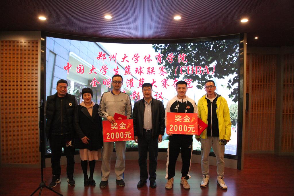 4月7日上午,郑州大学体育学院在教学楼3D实训室召开会议,对前不久在中国大学生篮球联赛(CUBA)全明星灌篮大赛夺冠的杨浩同学和郑大体院男子篮球队主教练黄伟老师进行表彰。郑大体院篮球队教练团队,男子篮球队队员,竞训处全体人员参加表彰会。