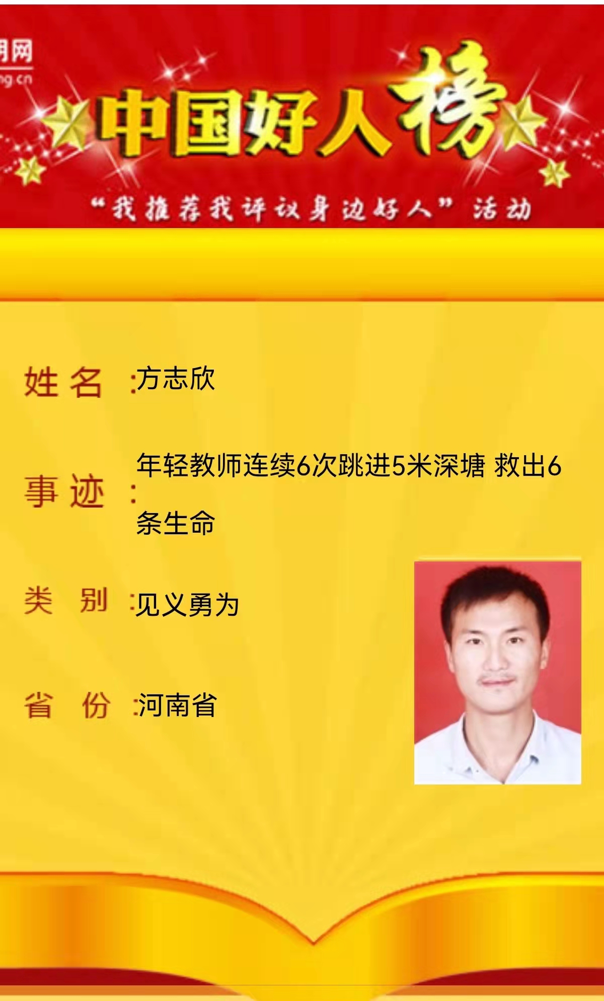 近日 ,中央文明办发布2021年10月“中国好人榜”,我院2016级学生马成龙因其在2020年夏黄河行洪期间27秒桨板救人的先进事迹而光荣登榜,位列见义勇为组。上榜人员名单经过初筛、网上展示、网友评议、专家评审产生。